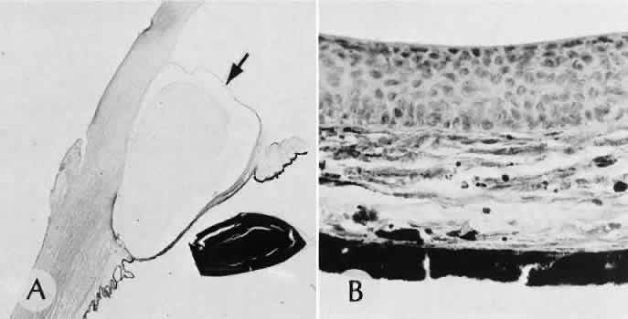 Penetrating keratoplasty wounds in enucleation specimens can be identified by the changes in Descemet's membrane (Fig. 18). Because the donor tissue is often from a younger person, Descemet's membrane of the graft is thinner than the peripheral membrane of the host. Occasionally, redundant Descemet's membrane from the host intentionally will be left behind in this region by the surgeon. Often small areas of retrocorneal fibrous plaque mark the posterior area of the wound, even in cases of clinically uncomplicated wound healing. In time, the stromal portion of the wound may be undetectable histologically although some malorientation of the collagen lamellae often is present. Bowman's membrane does not reform as a distinct membranelike structure. Needle tracks or suture material may be seen in the tissue adjacent to the wound. Occasionally, epithelial cells may extend for a considerable distance along these suture tracks.