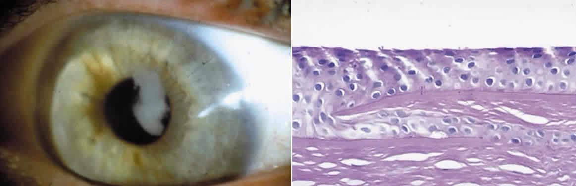 Epithelial cells are found covering surfaces of tissue. Two distinct types of epithelial cells cover the ocular surface: corneal epithelial cells and conjunctival epithelial cells. Cell replacement is accomplished by stem cells located at the limbus for the corneal epithelium8,9 and at the mucocutaneous junction and possibly throughout the conjunctiva for the conjunctival epithelium.10 Migration and proliferation of surrounding healthy epithelial cells heal surface discontinuity.